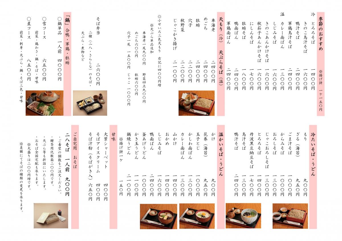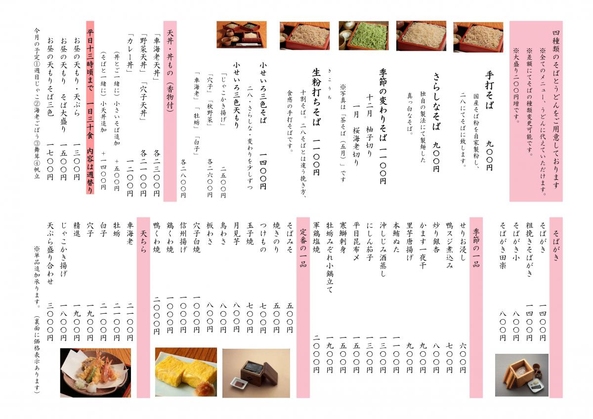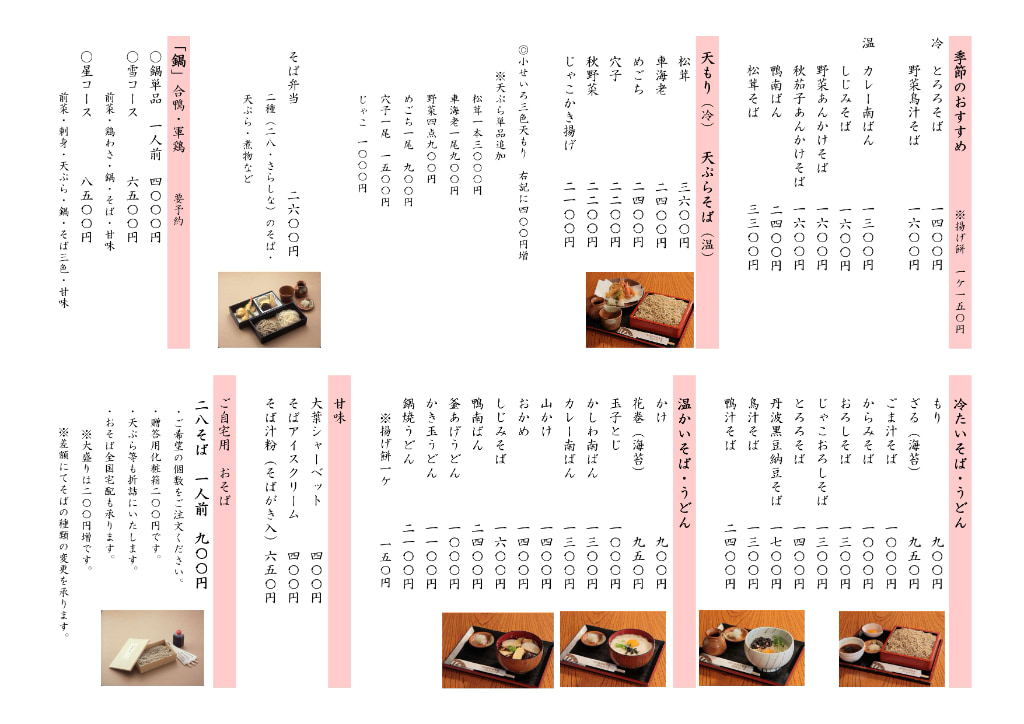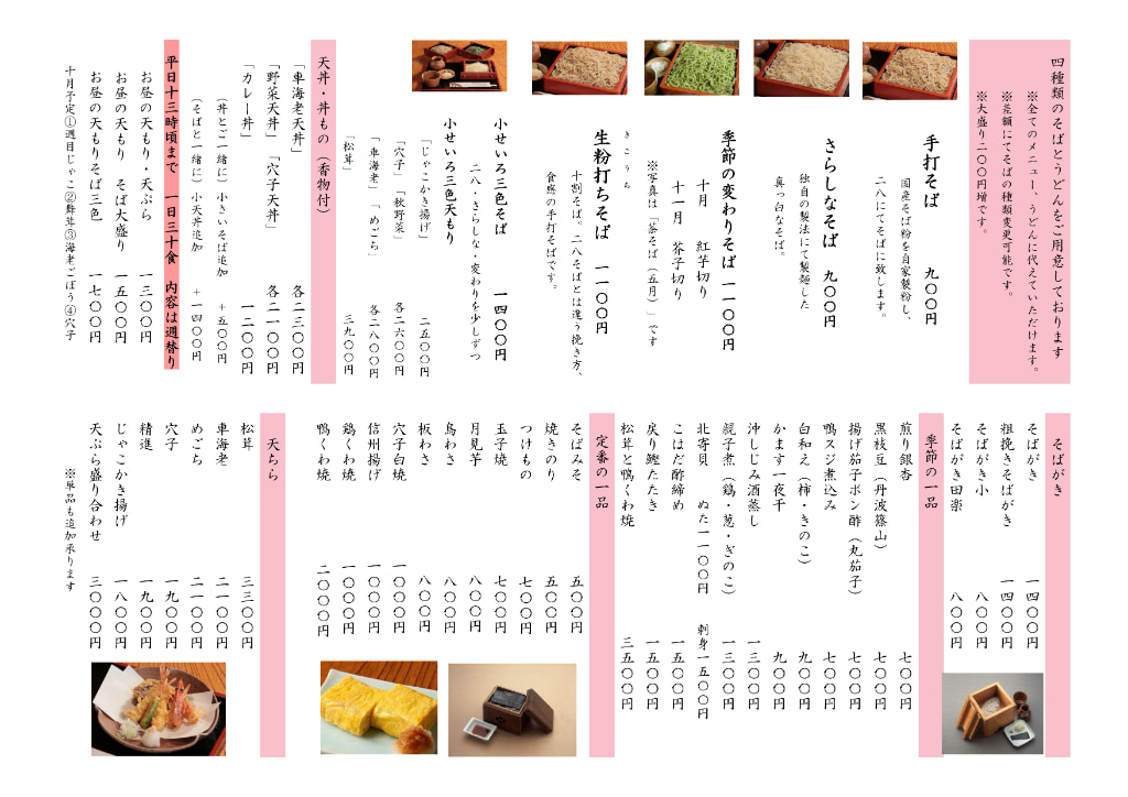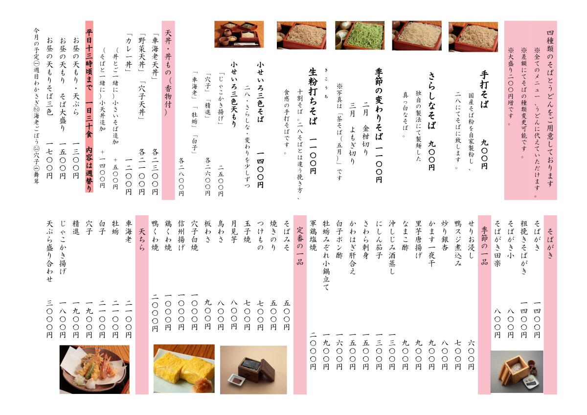 そば屋の品書きは年中変わることなく変化が少ないので、主人の「遊び心」も加えて考えられたといわれています。「変わりそば」の予定は下記の通りですが、遊び心満載のそばですので、主人の気分次第で変更することもありますことをご了承下さい。